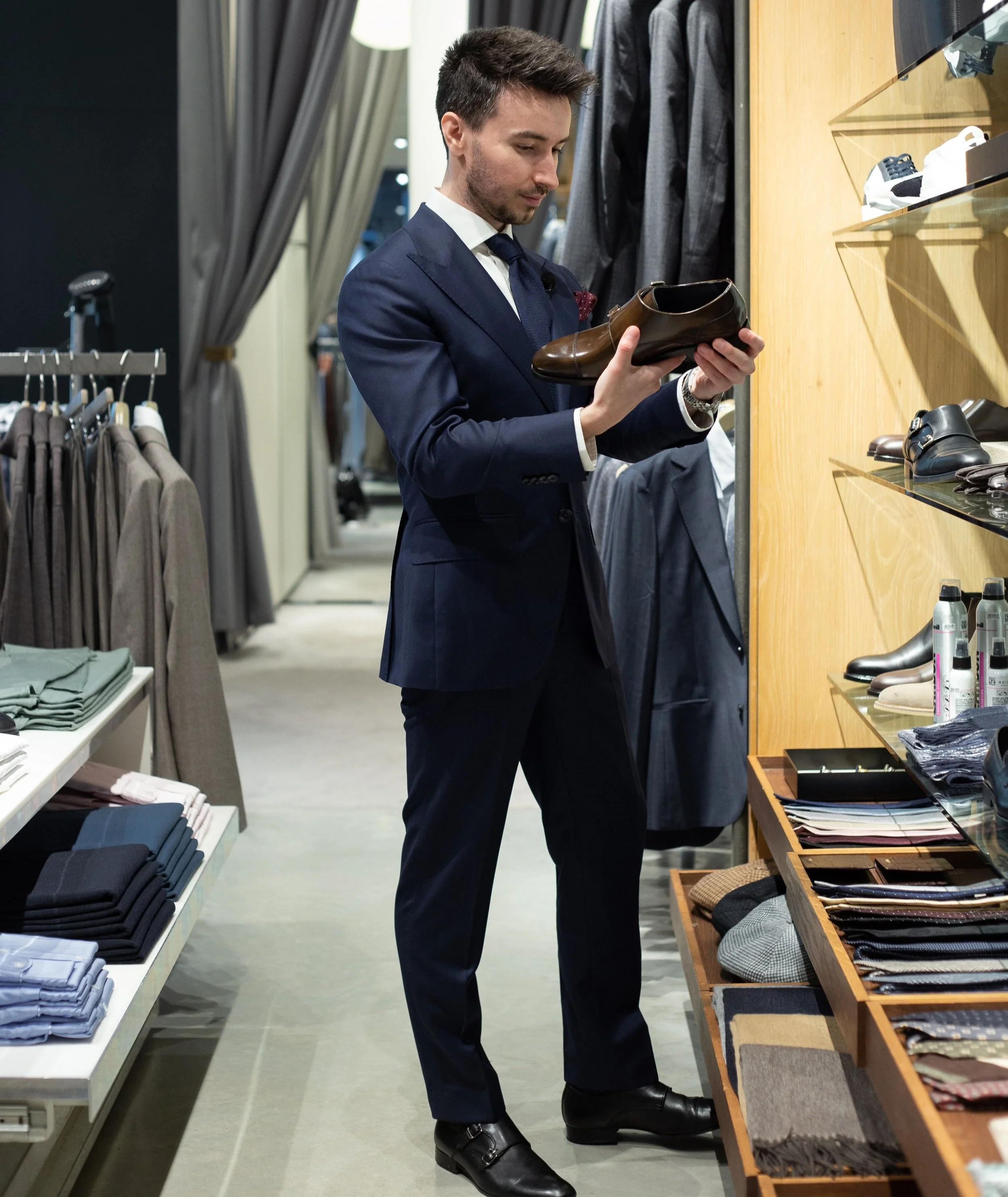 Made-to-measure involves choosing a set of pre-made fabrics (up to 200 usually). You have up to 20 measurements taken in one fitting and various design choices on the details. That information is sent to a factory off-site (sometimes abroad) to have the suit made to your measurements and styling and then you receive your final product. The final suit is often one that is available ready-to-wear from the brand, but this one is made to your measurements and style choices.