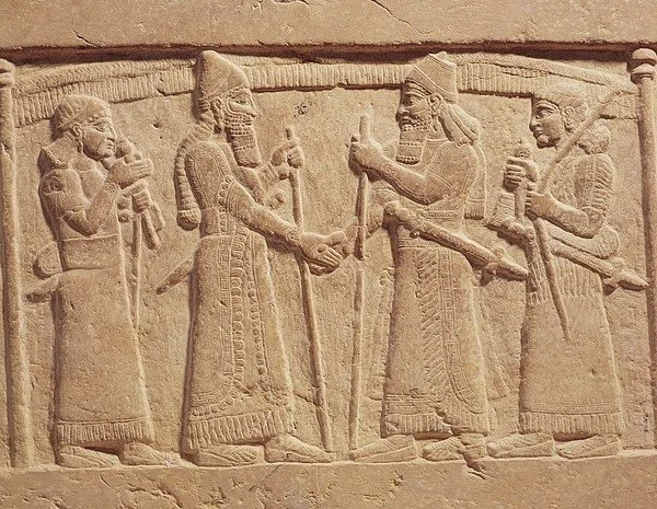Here King Shalmaneser III of Assyria is depicted shaking hands with a Babylonian on a stone dated to the 9th century B.C.