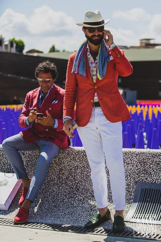 I’m a fool for a good coat as much as the next sartorial enthusiast, but when you insist on bright red or blue overcoats, with yellow gloves and orange socks all in one go – that sense of elegance almost feels withered and softened in an unfortunate way. It’s too much, frankly.